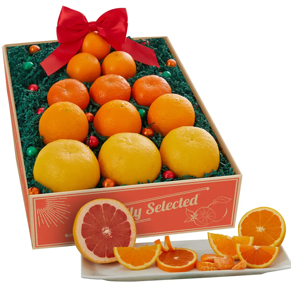 Anyone on your gift list will be delighted to receive this gift assortment! We carefully hand-pack the finest citrus in the shape of a Christmas Tree. Includes: Petite Red Navels, Honey-sweet Tangerines, Navel Oranges and seedless Ruby Red Grapefruit. Next we decorate it with colorful foil-wrapped chocolates and top the whole thing off with a big, festive bow.
