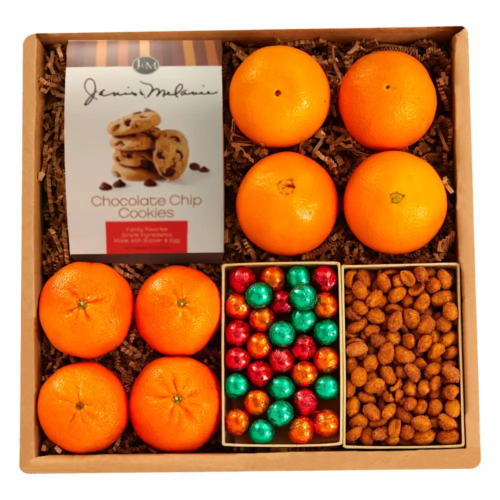 This citrus gift pairs nicely with salty snacks. They'll receive our seedless Navel Oranges, Honey Sweet Tangerines, Chocolate Chip Cookies, foil wrapped Milk Chocolates and Honey Roasted Almonds. All carefully hand-packed and delivered fresh.