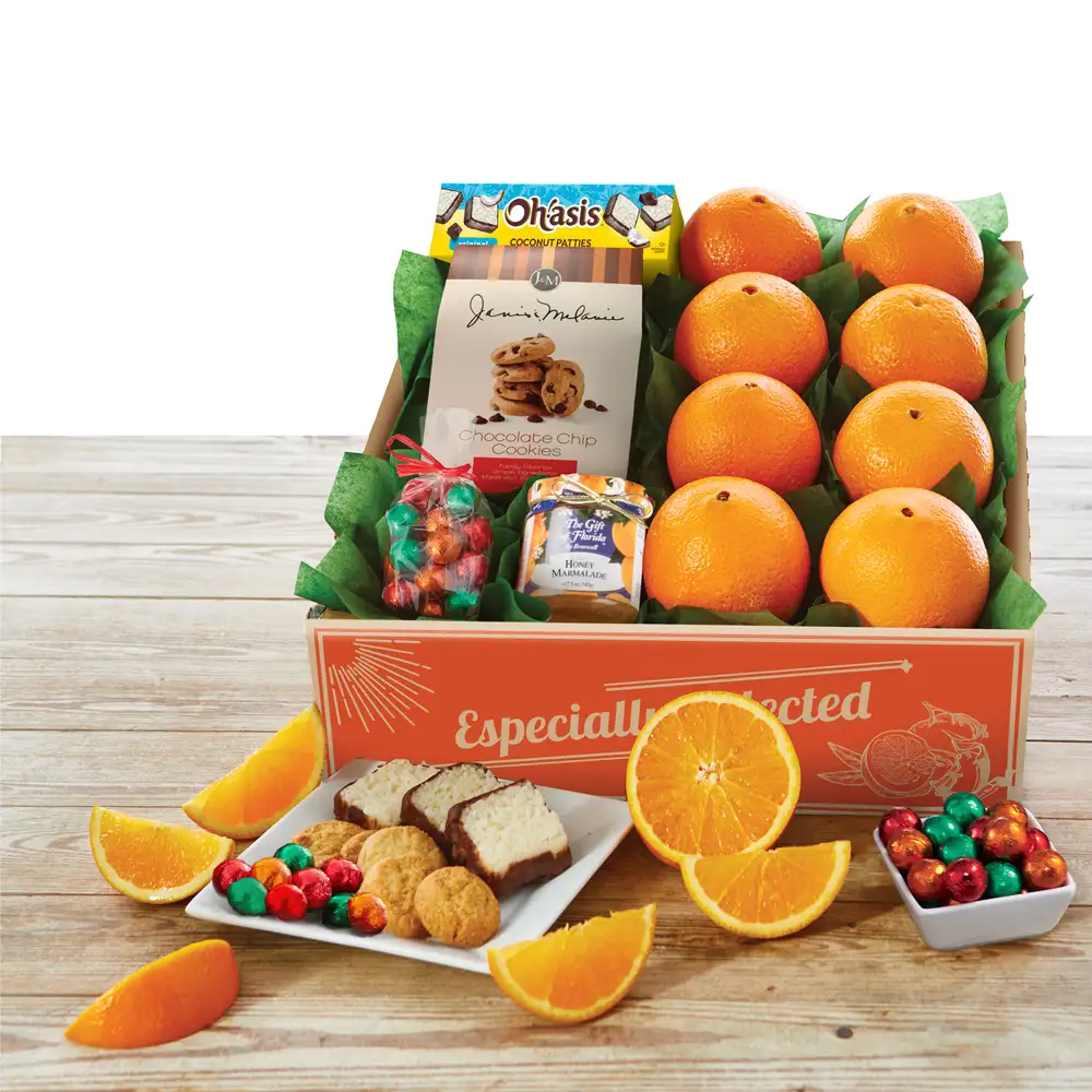 This Florida specialty pack combines a variety of the freshest citrus and Florida treats into a delicious gift assortment. This gift includes the sweetest, seedless Navel Oranges, Chocolate Chip Cookies, Florida Orange Marmalade , Creamy Chocolate Dipped Coconut Patties and colorful foil wrapped delicious Chocolate Balls. A great collection of the best citrus and sweets for all to enjoy.