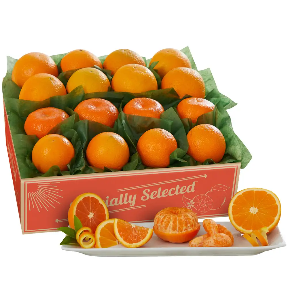 Rusty came up with the name for this gift one day when he got home from the grove with a big grin and a dry mouth. Nothing could quench him like the luscious, full-on juiciness of these extraordinary oranges. We pick and pack three of our very finest varieties for you and your friends: Golden Navels, Petite Scarlet Red Navels, and honey-sweet Tangerines.
