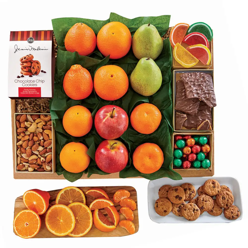 This fruit variety assortment takes the guesswork out of giving. For the fruit they'll receive Navel Oranges, Tangerines, Petite Navels, creamy D'Anjou Pears, and crisp Apples. Next comes the Chocolate Chip Cookies, Milk Chocolate Balls, Candy Fruit Slices, Deluxe Mixed Nuts and Toffee Bark. Something to please everyone.